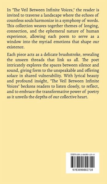 In "The Veil Between Infinite Voices," the reader is invited to traverse a landscape where the echoes of countless souls harmonize in a symphony of words. This collection weaves together themes of longing, connection, and the ephemeral nature of human experience, allowing each poem to serve as a window into the myriad emotions that shape our existence. Each piece acts as a delicate brushstroke, revealing the unseen threads that link us all. The poet intricately explores the spaces between silence and sound, giving form to the unspeakable and offering solace in shared vulnerability. With lyrical beauty and profound insight, "The Veil Between Infinite Voices" beckons readers to listen closely, to reflect, and to embrace the transformative power of poetry as it unveils the depths of our collective heart.