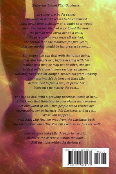Katherine Lillian Fitz: Goodness. Are they one in the same? The magical world seems to be convinced. Katy holds onto a shadow of a doubt as it would mean the person she had once loved the most, the person who loved her as a child, the person that she mourned for five years, that her mother would be her greatest enemy... But before she can deal with the White Being that still tempts her, before dealing with her mother who may or may not be alive, she has to deal with a much more serious situation... Not only has her Aunt Aaliyah broken out from Ghastly, the main Witch's Prison and Katy Lily determined to find a way to prove her innocence no matter the cost... But Katy has a growing Darkness inside of her... A Darkness that threatens to overwhelm and consume her and worst of all... two people blood related are encouraging her to harness this Darkness and use it. What will happen? Will Katy Lily find her way from the Darkness back into the light or when The Veil Lifts will all be forever lost?