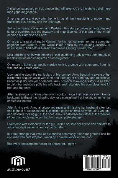 A mystery suspense thriller, a novel that will give you the insight to belief more than your imagination. A very gripping and powerful theme it has all the ingredients of modern and traditional life, destiny and the unknown. Set in the hearts of Kashmir and Pakistan, this story provides an amazing and cultural backdrop into the mystery and magnificence of this part of the world; deemed a 'Paradise on Earth'. On a trip to a rural village in Kashmir for his next consignment as a computer engineer from Lahore, Amir whilst taken aback by the alluring scenery, is astonished to find before him an even more alluring woman, Gori. Lost and tired; Amir, with the help of this enchanting lady arrives comfortably at his destination and completes his consignment. On return to Lahore a happily married Amir is greeted with open arms from his wife and soul mate Anny. Upon asking about the particulars of his journey, Anny becoming aware of her husband's acquaintance with Gori and learning of her beauty and excellence becomes jealous beyond compare. Amir however revoking his story in an effort to calm her jealously pulls his wife back and reiterates his boundless love for her, and her only. After receiving a lucrative offer which could change their lives for ever, Amir is beckoned to Egypt the following day for a consignment unlike any other he has carried out before. After Amir's exit, Anny all alone yet again and missing her husband after just one night of re-acquaintance is shocked to find an enviously beautiful yet poor and destitute looking girl at the door. Anny is baffled even further at the mention of her husband's name coming from a complete stranger. Overcome with clemency for the girl, invites her into her house and decides to accommodate her until her husbands return. Is it not strange that lives and lifestyles commonly taken for granted can be upturned into catastrophic turmoil by a simple knock on the door. But every knocking door must be answered... right?