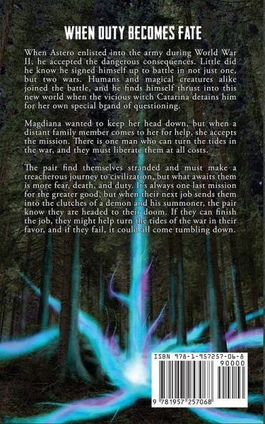 When Astero enlisted into the army during World War II, he accepted the dangerous consequences. Little did he know he signed himself up to battle in not just one, but two wars. Humans and magical creatures alike joined the battle, and he finds himself thrust into this new world when the vicious witch Catarina detains him for her own special brand of questioning. Magdiana wanted to keep her head down, but when a distant family member comes to her for help, she accepts the mission. There is one man who can turn the tides in the war, and they must liberate him at all costs. The pair find themselves stranded and must make a treacherous journey to civilization, but what awaits them is more fear, death, and duty. It's always one last mission for the greater good, but when their next job sends them into the clutches of a demon and his summoner, the pair know they are headed to their doom. If they can finish the job, they might help turn the tides of the war in their favor, and if they fail, it could all come tumbling down.
