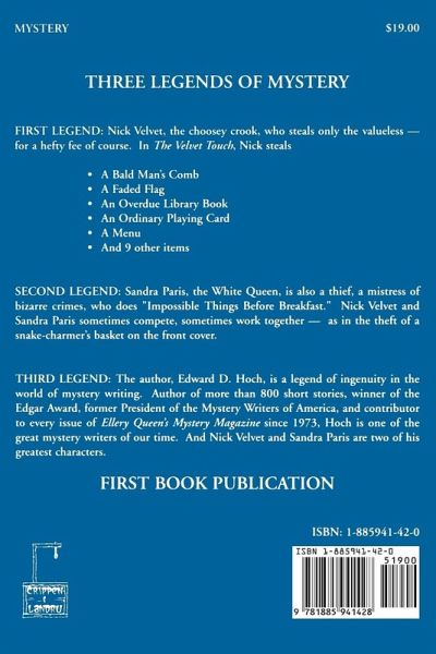 Edward D. Hoch's latest collection contains 14 stories about Nick Velvet, the choosey crook who steals only the seemingly valueless -- a bald man's comb, an overdue library book, a faded flag, a playing card, and so on. And in order to pull off a successful robbery, Nick often has to solve a crime as well -- sometimes the crimes committed by Sandra Paris, The White Queen, who claims to do impossible things before breakfast. The Velvet Touch contains all of Nick's encounters with the White Queen. The book includes an introduction by the author and a complete Nick Velvet checklist.