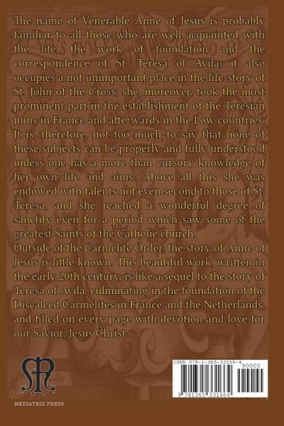 From the Preface "The name of Venerable Anne of Jesus is probably familiar to all those who are well acquainted with the life, the work of foundation and the correspondence of St. Teresa of Avila; it also occupies a not unimportant place in the life-story of St. John of the Cross; she, moreover, took the most prominent part in the establishment of the Teresian nuns in France and afterwards in the Low countries. It is, therefore, not too much to say that none of these subjects can be properly and fully understood unless one has a more than cursory knowledge of her own life and aims. Above all this she was endowed with talents not even second (according to the opinion of St. John of the Cross who was a good judge) to those of St. Teresa, and she reached a wonderful degree of sanctity even for a period which saw some of the greatest Saints of the Catholic church.