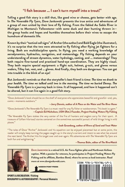 "I fish because ... I can't turn myself into a trout!" Telling a good fish story is a skill that, like good wine or cheese, gets better with age. In The Venerable Fly Tyers, Dave Jankowski presents the true antics and adventures of a group of men united by their love of fly fishing. From the fabled Au Sable River in Michigan to Montana's Yellowstone-with some duck and deer hunting thrown in-the group hooks and hopes and humbles themselves before their wives to escape the humdrum of domestic life. Known by their "tactical call signs" of Archer (the author) and Bald Eagle (the illustrator), it's no surprise that the two were attracted to fly fishing after flying jet fighters for a living. Both are multidiscipline sports. In flying, you need a working knowledge of aerodynamics, hydraulics, navigation, and meteorology. Fly fishing depends on your understanding of stream dynamics, water hydrology, casting, and ... meteorology! They both require fine-tuned and practiced hand-eye coordination. They are highly visual. They both require special equipment: a flight suit, helmet, g-suit, and gloves versus waders, Tilley hat, vest, and ... gloves. And finally, they both are dangerous: You can get into trouble in the blink of an eye! But Jankowski reminds us that the storyteller's best friend is time: The time we drank to your health. The time we talked until two in the morning. The time we buried Denny. The Venerable Fly Tyers is a journey back in time. It all happened, and how it happened can't be altered, but it can live again in a good fish story. This book is dedicated to the disabled American Veterans who have so honorably served their country since the early days of Vietnam, through all the Mideast conflicts, to this day and beyond. Dave Jankowski is a retired U.S. Air Force fighter pilot and Northwest Airlines caption. With a passion for veterans, he participates in Project Healing Waters Fly Fishing and its affiliate, Bamboo Bend, where he serves as lead instructor. Read more at www.davejankowski.com.