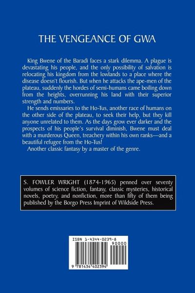 King Bwene of the Baradi faces a stark dilemma. A plague is devastating his people, and the only possibility of salvation is relocating his kingdom from the lowlands to a place where the disease doesn't flourish. But when he attacks the ape-men of the plateau, suddenly the hordes of semi-humans come boiling down from the heights, overrunning his land with their superior strength and numbers. He sends emissaries to the Ho-Tus, another race of humans on the other side of the plateau, to seek their help, but they kill anyone unrelated to them. As the days grow ever darker and the prospects of his people's survival diminish, Bwene must deal with a murderous Queen, treachery within his own ranks -- and a beautiful refugee from the Ho-Tus! Another classic fantasy by a master of the genre.