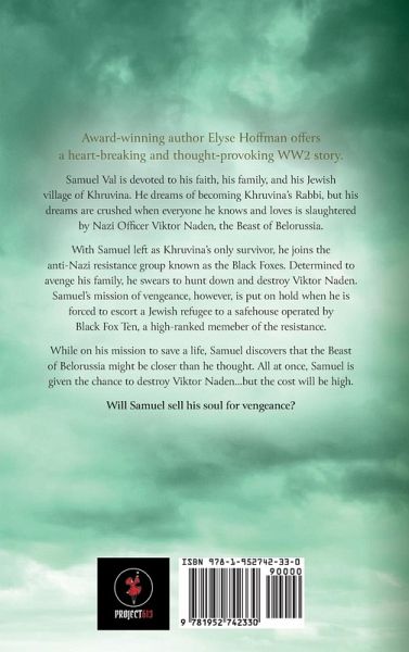 Samuel Val is blessed with a loving family and a tight-knit community in his Jewish village of Khruvina. He dreams of becoming Khruvina's Rabbi, but his dreams are crushed when his family is slaughtered by Nazi Officer Viktor Naden, the Beast of Belorussia. With Samuel left as Khruvina's only survivor, he joins the anti-Nazi resistance group known as the Black Foxes. Determined to avenge his family, he swears to hunt down and destroy Viktor Naden. Samuel's mission of vengeance, however, is put on hold when he is forced to escort a Jewish refugee to a safehouse operated by Black Fox Ten, a high-ranked member of the resistance. While on his mission to save a life, Samuel discovers that the Beast of Belorussia might be closer than he thought. All at once, Samuel is given the chance to destroy Viktor Naden...but the cost will be high. Will Samuel sell his soul for vengeance? Award-winning author Elyse Hoffman offers a heart-breaking and thought-provoking WW2 story.