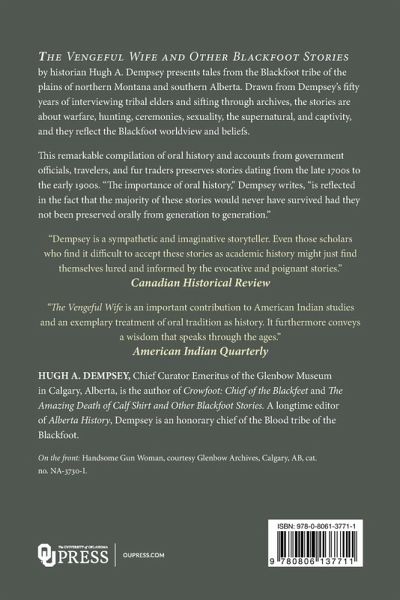 "The Vengeful Wife is an important contribution to American Indian studies and an exemplary treatment of oral tradition as history. It furthermore conveys a wisdom that speaks through the ages."-American Indian Quarterly The Vengeful Wife and Other Blackfoot Stories by historian Hugh A. Dempsey presents tales from the Blackfoot tribe of the plains of northern Montana and southern Alberta. Drawn from Dempsey's fifty years of interviewing tribal elders and sifting through archives, the stories are about warfare, hunting, ceremonies, sexuality, the supernatural, and captivity, and they reflect the Blackfoot worldview and beliefs. Hugh A. Dempsey, Chief Curator Emeritus of the Glenbow Museum in Calgary, Alberta, is the author of Crowfoot: Chief of the Blackfeet and The Amazing Death of Calf Shirt and Other Blackfoot Stories. A longtime editor of Alberta History, Dempsey is an honorary chief of the Blood tribe of the Blackfoot.