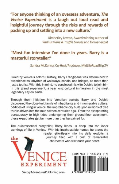 Lured by Venice's colorful history and its labyrinth of walkways, canals, and bridges, Barry wanted to be more than just a tourist. He convinced his wife Debbie to join him in his Venice experiment, a one-year cultural immersion. Through their initiation into Venetian society, Debbie and Barry discovered the close-knit family of its inhabitants and the oddities of living in Venice, the improbable city built upon millions of tree trunks driven into the mud sixteen centuries ago. From the exasperating bureaucracy to high tides endangering their ground-floor apartment, these expatriates get far more than they bargained for. The quintessential storyteller, Barry Frangipane draws us into the inner life of Venice. With his inexhaustible humor, he takes the reader on his journey abroad, a journey filled with a cast of remarkable characters who will touch your heart.