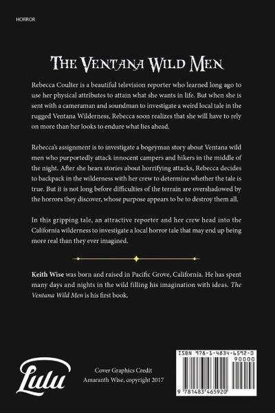 Rebecca Coulter is a beautiful television reporter who learned long ago to use her physical attributes to attain what she wants in life. But when she is sent with a cameraman and soundman to investigate a weird local tale in the rugged Ventana Wilderness, Rebecca soon realizes that she will have to rely on more than her looks to endure what lies ahead. Rebecca's assignment is to investigate a bogeyman story about Ventana wild men who purportedly attack innocent campers and hikers in the middle of the night. After she hears stories about horrifying attacks, Rebecca decides to backpack in the wilderness with her crew to determine whether the tale is true. But it is not long before difficulties of the terrain are overshadowed by the horrors they discover, whose purpose appears to be to destroy them all. In this gripping tale, an attractive reporter and her crew head into the California wilderness to investigate a local horror tale that may end up being more real than they ever imagined.