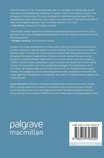In spite of the robust development of venture capital that has occurred over the last three decades, returns from venture capital have been declining. This book focuses on a simple question: why? The answer lies in the context of multiple deformations that have occurred throughout the venture capital process. The book critically assesses the ways in which interactions between different stakeholders in the venture capital ecosystem change (or "deform") venture capital, decreasing its value. Klonowski also reveals that venture capital actually has few benefits-and some outright disadvantages-for entrepreneurs, and it can create a self-perpetuating cycle of investment and loss for the entire venture capital industry. This is especially true as corporate governance and compensation structures may create significant misalignments, incongruities, and conflicts of interest between general and limited partners.
