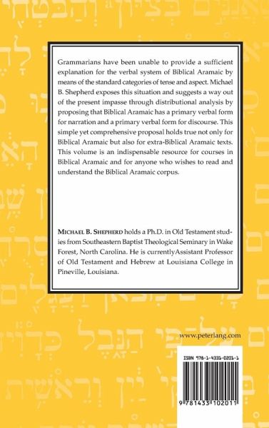 Grammarians have been unable to provide a sufficient explanation for the verbal system of Biblical Aramaic by means of the standard categories of tense and aspect. Michael B. Shepherd exposes this situation and suggests a way out of the present impasse through distributional analysis by proposing that Biblical Aramaic has a primary verbal form for narration and a primary verbal form for discourse. This simple yet comprehensive proposal holds true not only for Biblical Aramaic but also for extra-Biblical Aramaic texts. This volume is an indispensable resource for courses in Biblical Aramaic and for anyone who wishes to read and understand the Biblical Aramaic corpus.