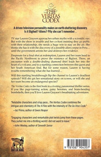 A driven television personality makes an earth-shattering discovery. Is it Bigfoot? Aliens? Pity she can't remember... TV star Lauren Grayson approaches urban myths with a scientific eye. But with the show in trouble and her co-host insisting they go public with their relationship, she needs a huge win to stay on the air. She thinks she has it with the discovery of a possible alien corpse in Peru... until the government arrests her and destroys her evidence. Desperate for a final shot at redemption, Lauren and her team head to the Pacific Northwest to prove the existence of Bigfoot. There, an encounter with a double-dealing diamond thief leads her into the heart of a volcano, and to a startling connection between this quest and her South American find. But for some reason, Lauren is having trouble remembering what she has learned... Will this startling breakthrough flip the channel to Lauren's deadliest episode? Will she get her sensational story on screen, or will she and her team become an endangered species? The Veritas Codex is the first book in a riveting paranormal thriller series. If you like page-turning action, gutsy heroines, and brain-bending bombshells, then you'll love Lauren Grayson's breathtaking adventures. Buy The Veritas Codex and follow the footprints to the truth today!