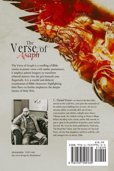The Verse of Asaph is a retelling of Bible stories in poetic verse with iambic pentameter; it employs potent imagery to transform spiritual matters into the grit beneath your fingernails. It is a candid and didactic examination of Bible characters highlighting their flaws to further emphasize the deeper intent of Holy Writ.