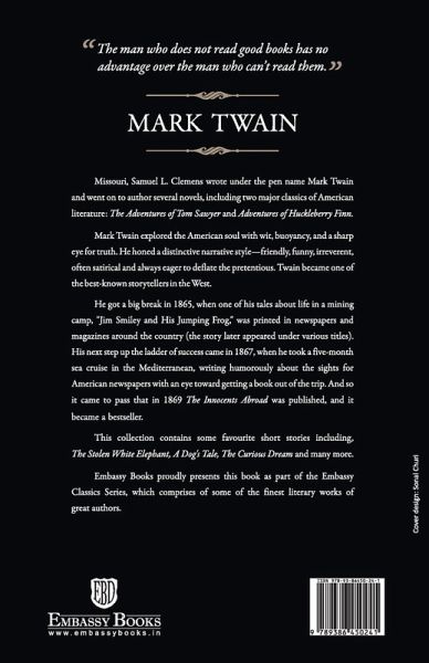 Missouri, Samuel L. Clemens wrote under the pen name Mark Twain and went on to author several novels, including two major classics of American literature: The Adventures of Tom Sawyer and Adventures of Huckleberry Finn. Mark Twain explored the American soul with wit, buoyancy, and a sharp eye for truth. He honed a distinctive narrative style?friendly, funny, irreverent, often satirical and always eager to deflate the pretentious. Twain became one of the best-known storytellers in the West. He got a big break in 1865, when one of his tales about life in a mining camp, "Jim Smiley and His Jumping Frog," was printed in newspapers and magazines around the country (the story later appeared under various titles). His next step up the ladder of success came in 1867, when he took a five-month sea cruise in the Mediterranean, writing humorously about the sights for American newspapers with an eye toward getting a book out of the trip. And so it came to pass that in 1869 The Innocents Abroad was published, and it became a bestseller. This collection contains some favourite short stories including, The Stolen White Elephant, A Dog?s Tale, The Curious Dream and many more. Embassy Books proudly presents this book as part of the Embassy Classics Series, which comprises of some of the finest literary works of great authors.