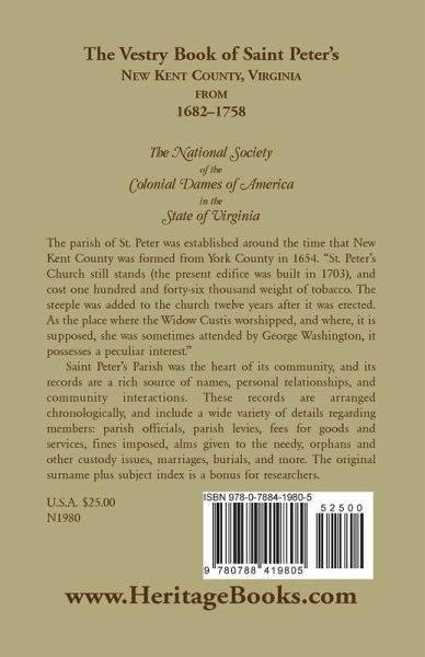 The parish of St. Peter was established around the time that New Kent County was formed from York County in 1654. "St. Peter's Church still stands (the present edifice was built in 1703), and cost one hundred and forty-six thousand weight of tobacco. The steeple was added to the church twelve years after it was erected. As the place where the Widow Custis worshipped, and where, it is supposed, she was sometimes attended by George Washington, it possesses a peculiar interest." Saint Peter's Parish was the heart of its community, and its records are a rich source of names, personal relationships, and community interactions. These records are arranged chronologically, and include a wide variety of details regarding members: parish officials, parish levies, fees for goods and services, fines imposed, alms given to the needy, orphans and other custody issues, marriages, burials, and more. The original surname plus subject index is a bonus for researchers.
