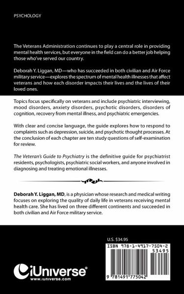The Veterans Administration continues to play a central role in providing mental health services, but everyone in the field can do a better job helping those who've served our country. Deborah Y. Liggan, MD-who has succeeded in both civilian and Air Force military service-explores the spectrum of mental health illnesses that affect veterans and how each disorder impacts their lives and the lives of their loved ones. Topics focus specifically on veterans and include psychiatric interviewing, mood disorders, anxiety disorders, psychotic disorders, disorders of cognition, recovery from mental illness, and psychiatric emergencies. With clear and concise language, the guide explores how to respond to complaints such as depression, suicide, and psychotic thought processes. At the conclusion of each chapter are ten study questions of self-examination for review. The Veteran's Guide to Psychiatry is the definitive guide for psychiatrist residents, psychologists, psychiatric social workers, and anyone involved in diagnosing and treating emotional illnesses.