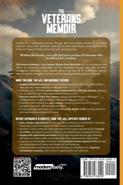 Discover true stories of World War II veterans who sacrificed for our freedoms. Embark on a journey through the combat stories of brave veterans. Honor their sacrifices, shed light on their experiences, and understand the profound impact of their actions that still resonate today. The Veterans Memoir, is a compilation that offers an immersive exploration of the frontlines through the eyes of these courageous individuals. Inside this book, readers will find:Gripping firsthand accounts of combat experiences and life during World War II, meticulously researched and vividly narrated. A diverse cast of heroes, each chapter dedicated to a different veteran, allowing you to step into their shoes and witness history unfold. Intimate details of their lives before, during, and after the war, offering a comprehensive understanding of their remarkable journeys. This book will help readers to:Gain a deeper appreciation for the sacrifices made by our World War II veterans, fostering a profound respect for their bravery and resilience. Develop a more profound understanding of the human experience during times of conflict, empowering you to reflect on the significance of peace and unity. Engage with captivating narratives that bridge the generational gap, allowing teenagers and adults alike to connect with these extraordinary individuals.