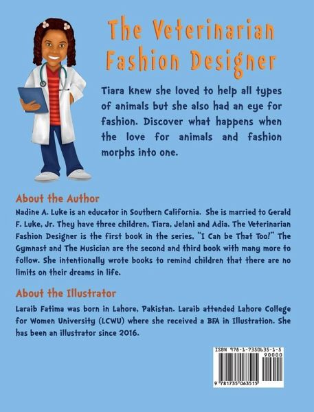 The Veterinarian Fashion Designer is the first book in the series, "I Can be That Too!" The Gymnast and The Musician are the second and third book with many more to follow. Nadine A. Luke intentionally wrote books to remind children that there are no limits on their dreams in life. The story is centered around a sweet little five year old girl named Tiara who has a love for fashion and animals. The reader is able to discover through a variety of situations and thoughts, what happens when the love for animals and fashion morphs into one.