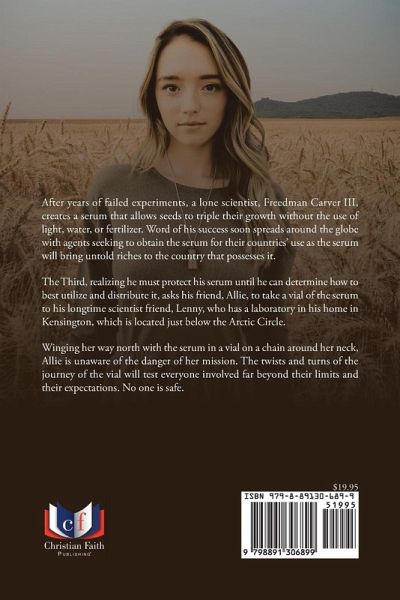 After years of failed experiments, a lone scientist, Freedman Carver III, creates a serum that allows seeds to triple their growth without the use of light, water, or fertilizer. Word of his success soon spreads around the globe with agents seeking to obtain the serum for their countries' use as the serum will bring untold riches to the country that possesses it. The Third, realizing he must protect his serum until he can determine how to best utilize and distribute it, asks his friend, Allie, to take a vial of the serum to his longtime scientist friend, Lenny, who has a laboratory in his home in Kensington, which is located just below the Arctic Circle. Winging her way north with the serum in a vial on a chain around her neck, Allie is unaware of the danger of her mission. The twists and turns of the journey of the vial will test everyone involved far beyond their limits and their expectations. No one is safe.