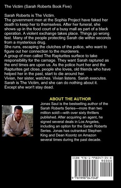 The Victim (Sarah Roberts Book Five) Sarah Roberts is The Victim. The government men at the Sophia Project have faked her death to keep her to themselves. After her funeral, she shows up in the food court of a busy mall as part of a black operation. A violent exchange takes place. Things go wrong fast. Many of the people protecting Sarah die within seconds from a mysterious drug. She runs, escaping the clutches of the police, who want to figure out her connection to the murderers. A group of men called The Rapturites surface to take responsibility for the carnage. They want Sarah raptured as the end times are upon us. As the police hunt her and the Rapturites get close, people she loves, old friends who have helped her in the past, start to die around her. Vivian, her sister, watches. Vivian listens. Sarah executes. Sarah is The Victim, and she can do nothing about it. Except she won't stay dead. Here's what readers are saying about the Sarah Roberts Series; ¿¿¿¿¿ - "This is a great series! I love it, and you should definitely read it! Each Sarah Roberts story gets more intriguing and more intense! I feel as if I know all the main characters personally, and I can't wait for the next thriller! Keep writing, Jonas Saul! Your fans await!" ¿¿¿¿¿ - "Jonas Saul is one of the most talented writers of our time." ¿¿¿¿¿ - "First book I read by Jonas Saul. One of the best books I have ever read." ¿¿¿¿¿ - "Amazing! I've been looking forward to starting this series for a while, and let me tell you, it does not disappoint! Absolutely filled to the brim with action, suspense, and thrills." ¿¿¿¿¿ - "These books are an action-packed adrenaline rush that left me hungry for more! With each twist and turn, I got more invested in Sarah and her family, and I felt their struggles and pain! The series combines my two favorite things for a story - a great, heart-thumping journey and characters I can connect with emotionally. Sarah Roberts is the perfect strong yet vulnerable heroine for men and women everywhere to admire!" ¿¿¿¿¿ - "I love Jonas Saul - my new favorite author." ¿¿¿¿¿ - "I am an avid reader of Stephen King and Dean Koontz, and Jonas Saul won me over with this book." ¿¿¿¿¿ - "To me, this is the best series I have ever read." ¿¿¿¿¿ - "Love the series. Can't wait till another comes out. Jonas Saul is a great storyteller. Send more!" ¿¿¿¿¿ - "The way the Sarah Roberts character grows and evolves is superb. Jonas Saul is one of the best contemporary writers alive today." ¿¿¿¿¿ - "I haven't read a book by Jonas Saul I haven't loved! Highly, highly, highly recommend!" ¿¿¿¿¿ - "This is one of the best mystery series ever written. Jonas Saul is amazing. I recommend the entire Sarah Roberts to any reader, whether you're into mysteries or not."
