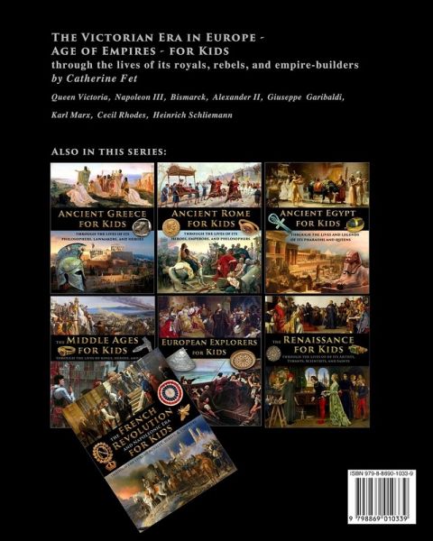 Like other books in this 'heritage history' series, "The Victorian Era in Europe - Age of Empires - for Kids" presents the events of mid-to-late 19th century European history through biographies of its "royals, rebels, and empire-builders" in a story-telling format. Dusty volumes, published in the days when history-teaching wasn't reduced to 'social studies,' overflow with historical anecdotes and details that would make our kids smile, and add a memorable 'human' touch to blunders, crimes, and victories of bygone eras' stars and villains. So, I spent a good year plowing through 19th and early 20th century biographical tomes, periodicals, and vintage childrens' histories, to translate a vast volume of stories and reports into narratives that can engage today's kids and teens. I tossed out exhaustive battle descriptions and analyses of dynastic feuds and politics to which our kids can't relate. I kept stories entertaining enough to bring to life the complex era that gave us phones, subways, and diamond engagement rings, along with Marxism, terrorism, the 'white man's burden,' and hundreds of thousands of long-lost graves of those who fell in brutal colonial and European imperial wars. As always, this book presents only historical facts and reports (no embellishment, fiction, or opinions of any kind) and stays firmly on track with kid-appropriate, family-friendly content. Meet Queen Victoria, French Emperor Napoleon III, German Reichskanzler Bismarck, Russian Emperor Alexander II, the hero of the Italian Wars of Independence Giuseppe Garibaldi, the creator of Marxism - Karl Marx, the British Empire builder and diamond monopolist Cecil Rhodes, and the legend of archaeology Heinrich Schliemann - they are all here. Since understanding Victorian-era history requires knowledge of certain political/economic concepts, the book offers paragraph-long definitions of- ideas, such as Realpolitik, liberalism, fatalism, socialism, communism, nihilism, anarchism, totalitarianism, populism, the Monroe Doctrine, ''the white man's burden,' 'jingoism...' - political movements and organizations, such as the Carbonari, Freemasons, Illuminati... - political/economic terms, such as monopoly, viceroy, protectorate, puppet regime, 'scorched earth' policy, and others. Did Queen Victoria actually say "We are not amused"? Why socialist economies fall apart, and why a communist socio-economic system has never existed in real life? Who came up with the diamond engagement ring 'tradition'? ... Your sleepless nights, pondering over these epic questions are over! Your kid will deliver the answers upon reading "The Victorian Era in Europe - Age of Empires - for Kids"!