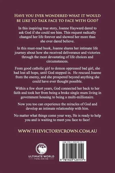 Have you ever wondered what it would be like to talk face to face with God? In this inspiring true story, Joanne Hayward dared to ask God if she could see him. This request radically changed her life forever and showed her more than she ever dared believe. In this must-read book, Joanne shares her intimate life journey about how she received deliverance and victories through the most devastating of life choices and circumstances. From good catholic girl to demon oppressed bad girl, she had lost all hope, until God stepped in. He rescued Joanne from the enemy, and she prospered beyond anything she could have ever thought possible. Within a few short years, God connected her back to her faith and took her from being a broke single mum living in government housing to being a multi-millionaire. Now you too can experience the miracles of God and develop an intimate relationship with him. No matter what things come your way, He is ready to help you and is waiting to meet you face to face!