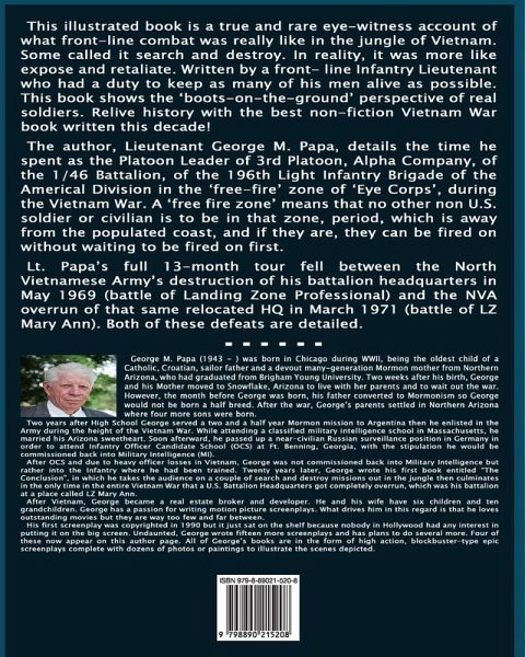 This illustrated book is a true and rare eye-witness account of what front-line combat was really like in the jungle of Vietnam. Some called it search and destroy. In reality, it was more like expose and retaliate. Written by a front- line Infantry Lieutenant who had a duty to keep as many of his men alive as possible. This book shows the 'boots-on-the-ground' perspective of real soldiers. Relive history with the best non-fiction Vietnam War book written this decade! The author, Lieutenant George M. Papa, details the time he spent as the Platoon Leader of 3rd Platoon, Alpha Company, of the 1/46 Battalion, of the 196th Light Infantry Brigade of the Americal Division in the 'free-fire' zone of 'Eye Corps', during the Vietnam War. A 'free fire zone' means that no other non U.S. soldier or civilian is to be in that zone, period, which is away from the populated coast, and if they are, they can be fired on without waiting to be fired on first. Lt. Papa's full 13-month tour fell between the North Vietnamese Army's destruction of his battalion headquarters in May 1969 (battle of Landing Zone Professional) and the NVA overrun of that same relocated HQ in March 1971 (battle of LZ Mary Ann). Both of these defeats are detailed.