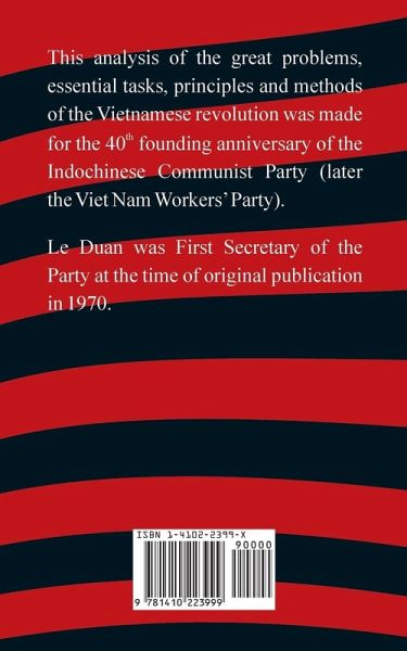 This analysis of the great problems, essential tasks, principles and methods of the Vietnamese revolution was made for the 40th founding anniversary of the Indochinese Communist Party (later the Viet Nam Workers' Party). Le Duan was First Secretary of the Party at the time of original publication in 1970.