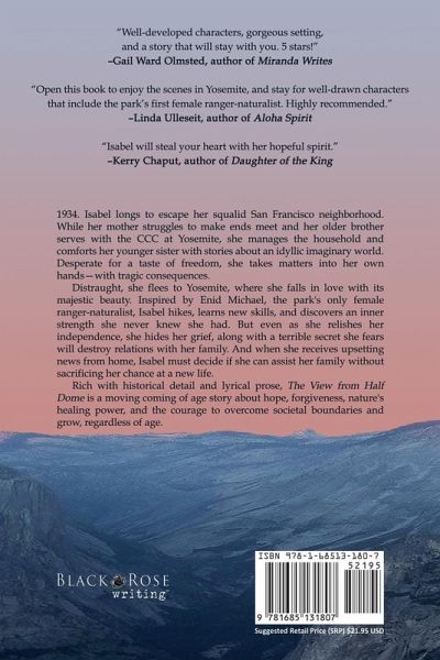 "Isabel will steal your heart with her hopeful spirit." -Kerry Chaput, author of Daughter of the King 1934. Isabel longs to escape her squalid San Francisco neighborhood. While her mother struggles to make ends meet and her older brother serves with the CCC at Yosemite, she manages the household and comforts her younger sister with stories about an idyllic imaginary world. Desperate for a taste of freedom, she takes matters into her own hands-with tragic consequences. Distraught, she flees to Yosemite, where she falls in love with its majestic beauty. Inspired by Enid Michael, the park's only female ranger-naturalist, Isabel hikes, learns new skills, and discovers an inner strength she never knew she had. But even as she relishes her independence, she hides her grief, along with a terrible secret she fears will destroy relations with her family. And when she receives upsetting news from home, Isabel must decide if she can assist her family without sacrificing her chance at a new life. Rich with historical detail and lyrical prose, The View from Half Dome is a moving coming of age story about hope, forgiveness, nature's healing power, and the courage to overcome societal boundaries and grow, regardless of age.
