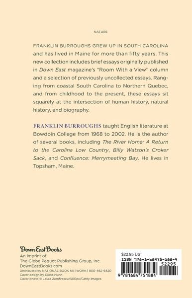 Franklin Burroughs grew up in South Carolina and has lived in Maine for more than fifty years. This new collection includes brief essays originally published in Down East magazine's "Room With a View" column and a selection of previously uncollected essays. Ranging from coastal South Carolina to Northern Quebec, and from his childhood to the present, these essays sit squarely at the intersection of human history, natural history, and biography.