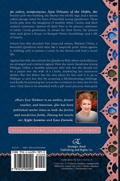In sultry, tempestuous New Orleans of the 1840s, the frontier port was bustling, the theater was all the rage, and a system called placage ruled the lives of beautiful young Quadroons. These lovely girls were the daughters of wealthy white Creoles and their mulatto mistresses, trained all their lives to be placees, mistresses of white Creole gentlemen. In return for their favors, the placees were each given a house on Rampart Street, furnishings, and a life of luxury. Forced into this decadent but respected system, Mariette Delon, a beautiful Quadroon with skin like a magnolia petal, rebels against it, wishing only to pursue a career in the theater and lead a moral life. Against her will, she attends the Quadroon Ball, where such alliances are arranged and contracts signed. Here she meets handsome young Philippe Grillet, a wealthy aristocrat who tells her she should not be a placee but the wife of a Creole, reinforcing her innermost desires. But her father has his own plans for her, and it is up to Philippe to save her, first by accepting a life-threatening challenge, and finally by pursuing her across the continent to claim her for his own. Only then is he rewarded with a gift more precious than gold. Mary Lou Widmer is an author, former teacher, and historian. She has been published twelve times in both the fiction and non-fiction fields. Among her novels are Night Jasmine and Lace Curtain. http://SBPRA.com/MaryLouWidmer