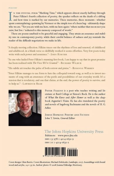 In the pivotal poem "Marking Time," which appears almost exactly halfway through Peter Filkins's fourth collection of poetry, the speaker reflects on the death of a sibling and how time is marked by our memories. These memories, these moments-whether spent contemplating a painting by Vermeer or the simple toss of a bean bag-ultimately shape who we are. "Yet you are with me here, with me here again, / where neither that moon nor you exist, but live / tethered to this memory composed of words." These are poems unafraid to be graceful and engaging. They attain an assurance and stability rare in contemporary poetry, while their careful balance of sadness and joy reminds the reader of the difficult negotiations we make in life.
