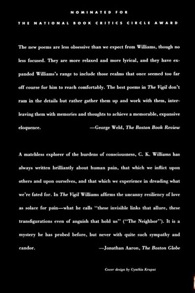 Nominated for the National Book Critics Circle Award The Vigil, which first appeared in 1997, finds contemporary American master-poet C. K. Williams taking a more reflective and empathetic turn in his work. As Jonathan Aaron wrote in The Boston Globe: "A matchless explorer of the burdens of consciousness, Williams has always written brilliantly about human pain, that which we inflict upon others and upon ourselves, and that which we experience in dreading what we're fated for. In The Vigil Williams affirms the uncanny resiliency of love as solace for pain-what he calls 'these invisible links that allure, these transfigurations even of anguish that hold us' ('The Neighbor'). It is a mystery he has probed before, but never with quite such sympathy and candor."
