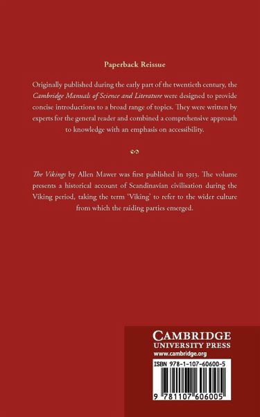 Originally published during the early part of the twentieth century, the Cambridge Manuals of Science and Literature were designed to provide concise introductions to a broad range of topics. They were written by experts for the general reader and combined a comprehensive approach to knowledge with an emphasis on accessibility. The Vikings by Allen Mawer was first published in 1913. The volume presents a historical account of Scandinavian civilisation during the Viking period, taking the term 'Viking' to refer to the wider culture from which the raiding parties emerged.