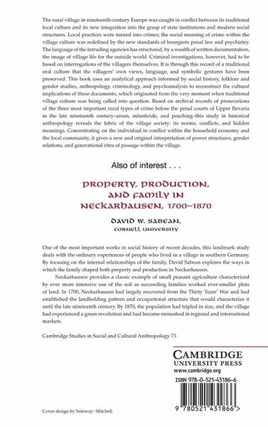 The rural village of nineteenth century Europe was caught in a conflict between its traditional local culture and its integration into new state institutions and modern social structures. Local practices were turned into crimes; the social meaning of crime within the village culture was redefined by the introduction of bourgeois penal law and psychiatry. The language of the intruding agencies has created, through a wealth of written documentation, an image of village life for the outside world. Criminal investigations, however, had to be based on interrogations of the villagers themselves, and it was through this questioning process that their own views, language, and symbolic gestures went on record. In this book, first published in 1994, Schulte provides an interpretation of village power structures, gender relations, and generational rites of passage in Upper-Bavaria through a close examination of the proceedings before the penal courts of Upper-Bavaria for the three most important types of rural crime: arson, infanticide, and poaching.