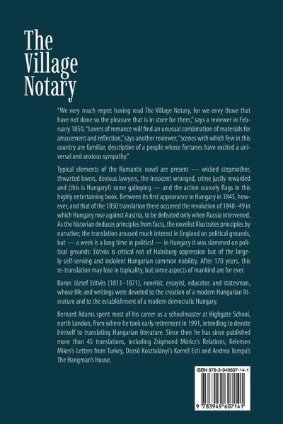 The Village Notary, originally published in 1845, presents a cross-section of Hungarian society in which the ruling elite were all too often lazy and self-seeking while the lesser lights, whatever their sterling qualities, were at their mercy and open to abuse. Eötvös's primary purpose was to expose the unsatisfactory nature of the traditional county administration. Hungary could hardly be considered a nation when so few of the people derived benefit or protection from the way that affairs were handled. The book holds a balance between racy tale and the author's frequently trenchant commentary on the Hungary of his time. In the English translation of 1850 it is significantly abridged in favor of the racy tale, thus diluting Eötvös's purpose not a little. The present translation is made from the unabridged Hungarian, and one must hope that while being better informed of Eötvös's aims the reader of this version will suffer no loss of entertainment.