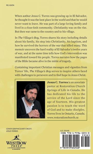 When author Jesus C. Torres was growing up in El Salvador, he thought it was the best place in the world and that he would never want to leave. He was part of a large loving family and lived in a close-knit community. Christianity was on the rise. But then war came to the country and to his village. In The Village's Boy, Torres shares his story including details about his family, his step into Christianity, his baptism, and how he survived the horrors of the war that killed many. This memoir uncovers the hard reality of El Salvador's twelve years of war, and at the same time tells how God's intervention was manifested toward his people. Torres narrates how the pages of the Bible became alive in the midst of tragedy. Containing important Christian messages and vignettes from Torres' life, The Village's Boy serves to inspire others faced with challenges to persevere and to find hope in Jesus Christ.