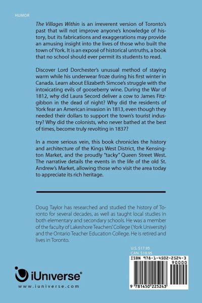 The Villages Within is an irreverent version of Toronto's past that will not improve anyone's knowledge of history, but its fabrications and exaggerations may provide an amusing insight into the lives of those who built the town of York. It is an exposé of historical untruths, a book that no school should ever permit its students to read. Discover Lord Dorchester's unusual method of staying warm while his underwear froze during his first winter in Canada. Learn about Elizabeth Simcoe's struggle with the intoxicating evils of gooseberry wine. During the War of 1812, why did Laura Secord deliver a cow to James Fitzgibbon in the dead of night? Why did the residents of York fear an American invasion in 1813, even though they needed their dollars to support the town's tourist industry? Why did the colonists, who never bathed at the best of times, become truly revolting in 1837? In a more serious vein, this book chronicles the history and architecture of the Kings West District, the Kensington Market, and the proudly "tacky" Queen Street West. The narrative, details the events in the life of the old St. Andrew's Market, allowing those who visit it today to appreciate its rich heritage.