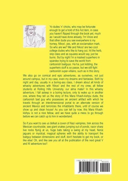 NEW!! The entire story can be previewed publicly at the following site: http://www.webtoons.com/en/challenge/the-vince-and-nikos-chronicles-presents-sunbaked/list?title_no=24805 The story follows the comical misadventures of Vince and Nikos, two college students who get wrapped up in all kinds of mishaps around their university, as well as the main story, which actually takes place in Vince's dreams, where the gang end up going through an interdimensional gateway to ancient Mexico to find and battle an ancient demonic entity who possesses Pandora's Box, and to free the people there from this creature once and for all. Disclaimer: This book is intended for mature audiences, as it does contain drug and alcohol use references, some brief nudity, language and generally adult subject matter.