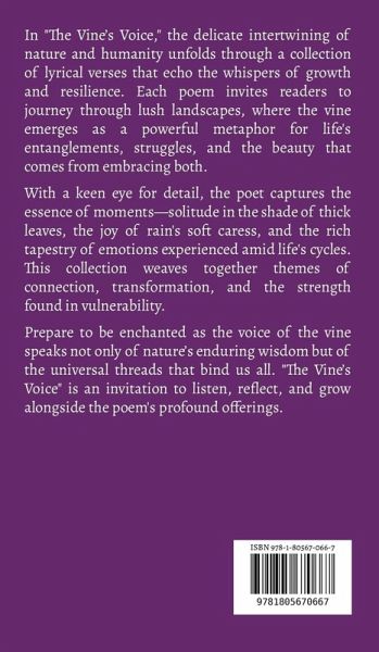 In "The Vine's Voice," the delicate intertwining of nature and humanity unfolds through a collection of lyrical verses that echo the whispers of growth and resilience. Each poem invites readers to journey through lush landscapes, where the vine emerges as a powerful metaphor for life's entanglements, struggles, and the beauty that comes from embracing both. With a keen eye for detail, the poet captures the essence of moments-solitude in the shade of thick leaves, the joy of rain's soft caress, and the rich tapestry of emotions experienced amid life's cycles. This collection weaves together themes of connection, transformation, and the strength found in vulnerability. Prepare to be enchanted as the voice of the vine speaks not only of nature's enduring wisdom but of the universal threads that bind us all. "The Vine's Voice" is an invitation to listen, reflect, and grow alongside the poem's profound offerings.