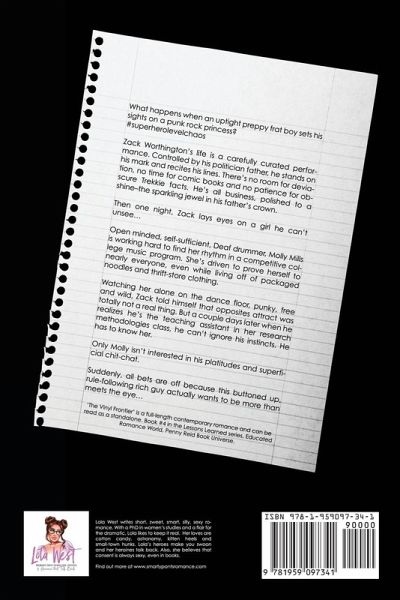What happens when an uptight preppy frat boy sets his sights on a punk rock princess? #superherolevelchaos Zack Worthington's life is a carefully curated performance. Controlled by his politician father, he stands on his mark and recites his lines. There's no room for deviation, no time for comic books and no patience for obscure Trekkie facts. He's all business, polished to a shine-the sparkling jewel in his father's crown. Then one night, Zack lays eyes on a girl he can't unsee... Open minded, self-sufficient, Deaf drummer, Molly Mills is working hard to find her rhythm in a competitive college music program. She's driven to prove herself to nearly everyone, even while living off of packaged noodles and thrift-store clothing. Watching her alone on the dance floor, punky, free and wild, Zack told himself that opposites attract was totally not a real thing. But a couple days later when he realizes he's the teaching assistant in her research methodologies class, he can't ignore his instincts. He has to know her. Only Molly isn't interested in his platitudes and superficial chit-chat. Suddenly, all bets are off because this buttoned up, rule-following rich guy actually wants to be more than meets the eye... 'The Vinyl Frontier' is a full-length contemporary romance and can be read as a standalone. Book #4 in the Lessons Learned series, Educated Romance World, Penny Reid Book Universe.