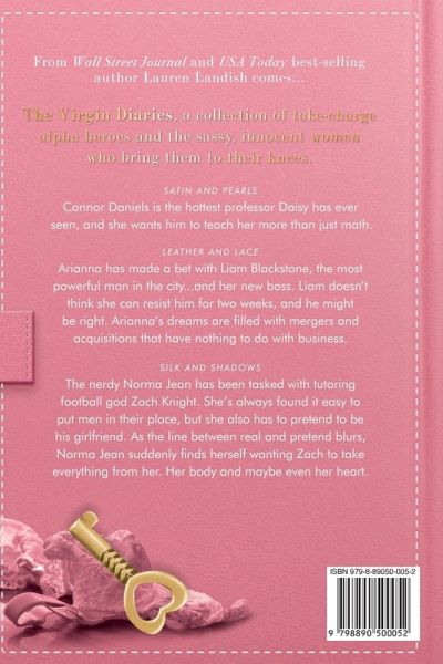 From Wall Street Journal and USA Today bestselling author Lauren Landish comes The Virgin Diaries, a series of take-charge alpha heroes and the sassy, innocent women who bring them to their knees. Satin and Pearls A naughty professor. A sexy student. Connor Daniels is the hottest Professor Daisy has ever seen, but his cocky arrogance and demand for perfection is a thorn in her side. So why can't she stop thinking about him, about how she wants him to teach her a lot more than just Math? One night changes everything and he + she = a steamy problem. Connor can't help wanting to learn Daisy's every detail, but can their love be the solution they're both looking for? Leather and Lace A demanding boss. A bold intern. Arianna's new boss is Liam Blackstone, the most powerful man in the city. He's used to getting what he wants and he's set his sights on Arianna. She makes a deal with devil to learn all about the business, but mixing their professional and personal lives could be more dangerous than either of them thought. Silk and Shadows A bossy jock. A sassy nerd. The nerdy Norma Jean has been tasked with tutoring insufferable football god Zach Knight. Worse yet, no one can know, so she has to pretend to be his girlfriend as a cover story. As if anyone would believe that. But as the line between real and pretend blurs, her snarls become purrs, and her bratty pouts become naughty invitations. When the clock runs out on their fake relationship, will they have found a forever kind of love in the library?