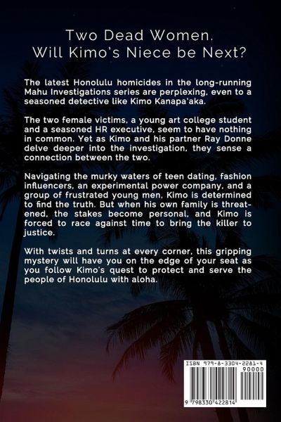 Two Dead Women. Will Kimo's Niece be Next? The latest Honolulu homicides in the long-running Mahu Investigations series are perplexing, even to a seasoned detective like Kimo Kanapa'aka. The two female victims, a young art college student and a seasoned HR executive, seem to have nothing in common. Yet as Kimo and his partner Ray Donne delve deeper into the investigation, they sense a connection between the two. Navigating the murky waters of teen dating, fashion influencers, an experimental power company, and a group of frustrated young men, Kimo is determined to find the truth. But when his own family is threatened, the stakes become personal, and Kimo is forced to race against time to bring the killer to justice.