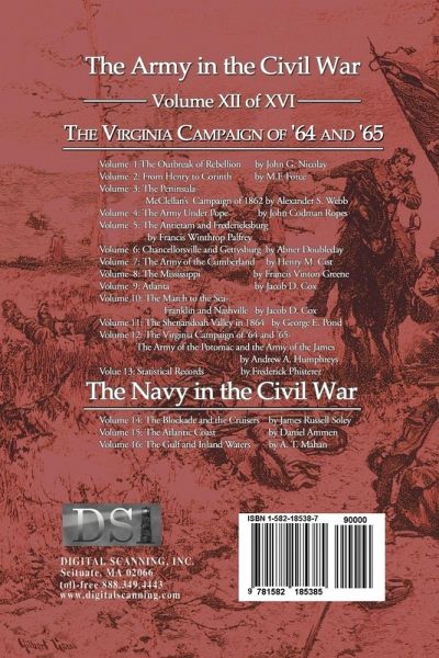 This is Volume 12 of a 16 Volume set originally published in 1885 by Charles Scribners's & Sons. Written by 14 different authors such as Abner Doubleday, John Nicolay and Jacob D. Cox, these volumes present the Army and the Navy in the Civil war. The Army series covers causes and battles from the " Outbreak of Rebellion" to "Chancellorsville and Gettysburg" and on the "Virginia Campaign of '64 and '65. A volume of Statistical Records completes the Army set. The three volumes about the Navy include "The Blockade and the Cruisers", "The Atlantic Coast" and "The Gulf and Inland Waters". Each volume contains a wealth of information, with its own introduction, preface, index, appendix(s), illustrations and maps. As a set, it is in-depth view the Civil War.