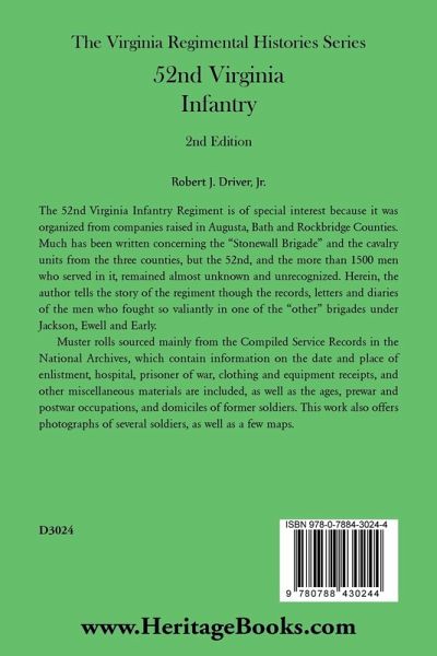 The 52nd Virginia Infantry Regiment is of special interest because it was organized from companies raised in Augusta, Bath and Rockbridge Counties. Much has been written concerning the "Stonewall Brigade" and the cavalry units from the three counties, but the 52nd, and the more than 1500 men who served in it, remained almost unknown and unrecognized. Herein, the author tells the story of the regiment though the records, letters and diaries of the men who fought so valiantly in one of the "other" brigades under Jackson, Ewell and Early. Muster rolls sourced mainly from the Compiled Service Records in the National Archives, which contain information on the date and place of enlistment, hospital, prisoner of war, clothing and equipment receipts, and other miscellaneous materials are included, as well as the ages, prewar and postwar occupations, and domiciles of former soldiers. This work also offers photographs of several soldiers, as well as a few maps.