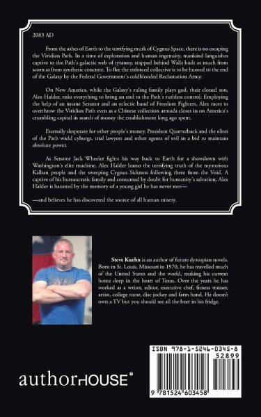 2083 AD From the ashes of Earth to the terrifying murk of Cygnus Space, there is no escaping the Viridian Path. In a time of exploration and human ingenuity, mankind languishes captive to the Path's galactic web of tyranny, trapped behind Walls built as much from scorn as from synthetic concrete. To flee the enforced collective is to be hunted to the end of the Galaxy by the Federal Government's coldblooded Reclamation Army. On New America, while the Galaxy's ruling family plays god, their cloned son, Alex Halder, risks everything to bring an end to the Path's ruthless control. Employing the help of an insane Senator and an eclectic band of Freedom Fighters, Alex races to overthrow the Viridian Path even as a Chinese collection armada closes in on America's crumbling capital in search of money the establishment long ago spent. Eternally desperate for other people's money, President Quarterback and the elites of the Path wield cyborgs, trial lawyers and other agents of evil in a bid to maintain absolute power. As Senator Jack Wheeler fights his way back to Earth for a showdown with Washington's elite machine, Alex Halder learns the terrifying truth of the mysterious Kalban people and the sweeping Cygnus Sickness following them from the Void. A captive of his bureaucratic family and consumed by doubt for humanity's salvation, Alex Halder is haunted by the memory of a young girl he has never met- -and believes he has discovered the source of all human misery.