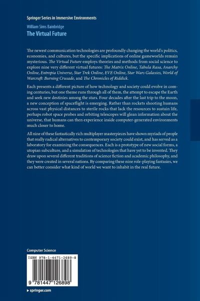 The newest communication technologies are profoundly changing the world's politics, economies, and cultures, but the specific implications of online game worlds remain mysterious. The Virtual Future employs theories and methods from social science to explore nine very different virtual futures: The Matrix Online, Tabula Rasa, Anarchy Online, Entropia Universe, Star Trek Online, EVE Online, Star Wars Galaxies, World of Warcraft: Burning Crusade, and The Chronicles of Riddick.