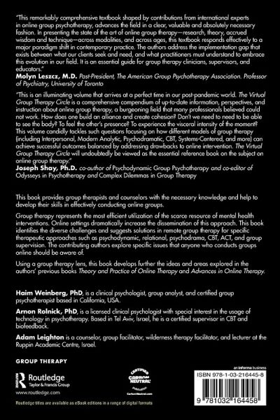 "The Virtual Group Therapy Circle is a highly valuable book for anyone looking to expand their understanding of different approaches to group therapy in the online setting. The authors provide a thorough examination of various techniques and strategies of online work, making it an invaluable resource for both new and experienced practitioners. Weinberg, Rolnick and Leighton have done an excellent job exploring the unique challenges and opportunities that come with online group therapy and provide a wealth of information on different approaches, including cognitive-behavioral, psychodrama, psychoanalytic, training and supervision groups. The book covers all aspects of online group therapy, from the technical to the therapeutic. I highly recommend The Virtual Group Therapy Circle, the first book of its kind, for anyone interested in the field."