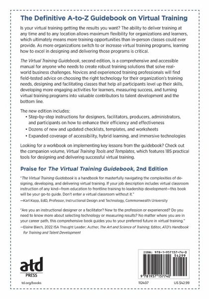 The Definitive A-to-Z Guidebook on Virtual Training Is your virtual training getting the results you want? The ability to deliver training at any time and to any location allows maximum flexibility for organizations and learners, which ultimately means more training opportunities than in-person classes could ever provide. As more organizations switch to or increase virtual training programs, learning how to excel in designing and delivering those programs is critical. The Virtual Training Guidebook, second edition, is a resource that will make the difference for beginners and veterans alike. It is a comprehensive and accessible manual for anyone who needs to create robust employee training solutions that solve real-world business challenges. Novices and experienced training professionals will find field-tested advice on choosing the right technology for their organization's training needs, designing and facilitating classes that help all participants level up their skills, developing more engaging activities for learners, measuring success, and turning virtual training programs into valuable contributors to talent development and the bottom line. The new edition includes:Step-by-step instructions for designers, facilitators, producers, administrators, and participants on how to enhance their efficiency and effectiveness Dozens of new and updated case studies and practical checklists, templates, and worksheets Expanded coverage of accessibility, hybrid learning, and immersive technologies A look at what’s trending in global classrooms and mobile technology Looking for a workbook on implementing key lessons from the guidebook? Be sure to check out the companion volume, Virtual Training Tools and Templates, featuring 185 checklists, questionnaires, templates, and other practical tools. These two volumes combined cover what you need to know to design and deliver successful virtual training.