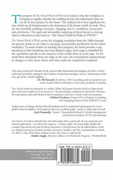The purpose of this book project is to analyze why the workplace is changing so rapidly, identify the enabling factors and understand what we can do to best prepare for the future. The analysis led to four significant factors which are all fundamental to the formation of the future world of work. They are the incredible enabling technologies, changing attitudes, workforce demographics and globalization. The rapid and irreversible coalescing of these factors is creating what is referred to in the book as, "The Virtual World of Work or VWOW." The book covers the changing workplace from the 1960s through to the present, and then looks to see what is emerging next and provides predictions for the future workplace. To assist the readers in tracking their progress, the book provides a segmentation of this time frame into four distinct stages. Each stage is identified by the capabilities specific to the majority of the worker force in each stage. As the work force transitions from one stage to the next, the accumulated enhancements or changes to who, how, where and when tasks are completed is explored. The book project introduces some original thinking and combines this with the knowledge and expertise from the leaders in this new field. The book is organized around five basic questions concerning the virtual world of work. The questions are: ² What is the Virtual World of Work? ² What Factors have Enabled the Virtual World of Work? ² Will the Virtual World of Work Continue? ² How will the Virtual World Work? ² How to Architect the Virtual World of Work? The book covers why the change is happening and how we can better plan for the future virtual world of work. Over 25 million workers in the U.S. work from home at least a few days per month. More and more workers are joining these virtual workers daily and the amount of time worked out of the traditional office is growing even more rapidly. There are literally millions of people who need the information in this book.