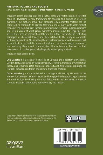 This open access book explores the idea that corporate rhetoric can be a force for good. In developing a new framework for analysis and discussion of green marketing, the authors argue that corporate environmental rhetoric can be harnessed to contribute to climate transition and a more sustainable market economy. The work explores the transformative power inherent in green promises and sets a vision of what green marketers should strive for. Engaging with selected research on organizational theory, the authors negotiate the conflicting paradigms of rhetorical theory and their relation to the study of corporate legitimation practices. The resulting theoretical framework provides an analytical scheme that can be useful in various disciplines - such as sociology, economics, law, marketing theory, and communication. It also illustrates how we can find new answers to contemporary challenges by re-imagining rhetoric.